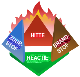 De belangrijkste elementen voor de kettingreactie van een brand zijn de elementen hydroxide (OH), waterstof (H) & zuurstof (O).