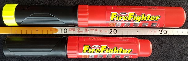 Het bovenste deel van een FireFighter-brandblusapparaat bestaat uit een metalen buis die de bluslading bevat. Het onderste deel is gemaakt van kunststof en dient als handvat.